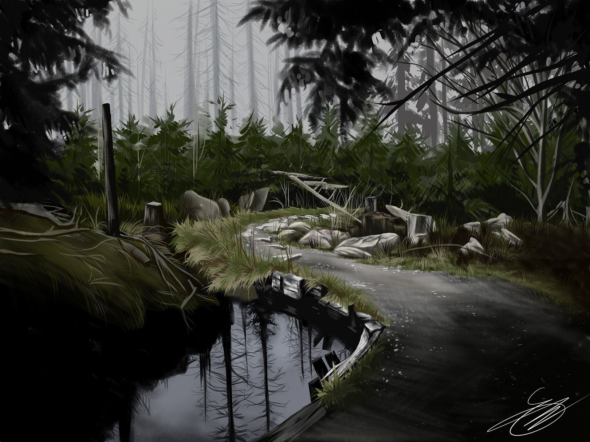 This is a reproduction of an image that caught my attention, namely a green swamp full of details that resulted in a naturalistic composition.